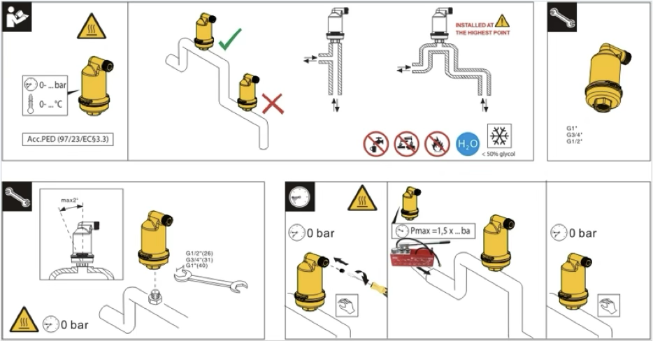 Устанавливается в верхних и конечных точках системы, где наиболее вероятно скопление воздуха: