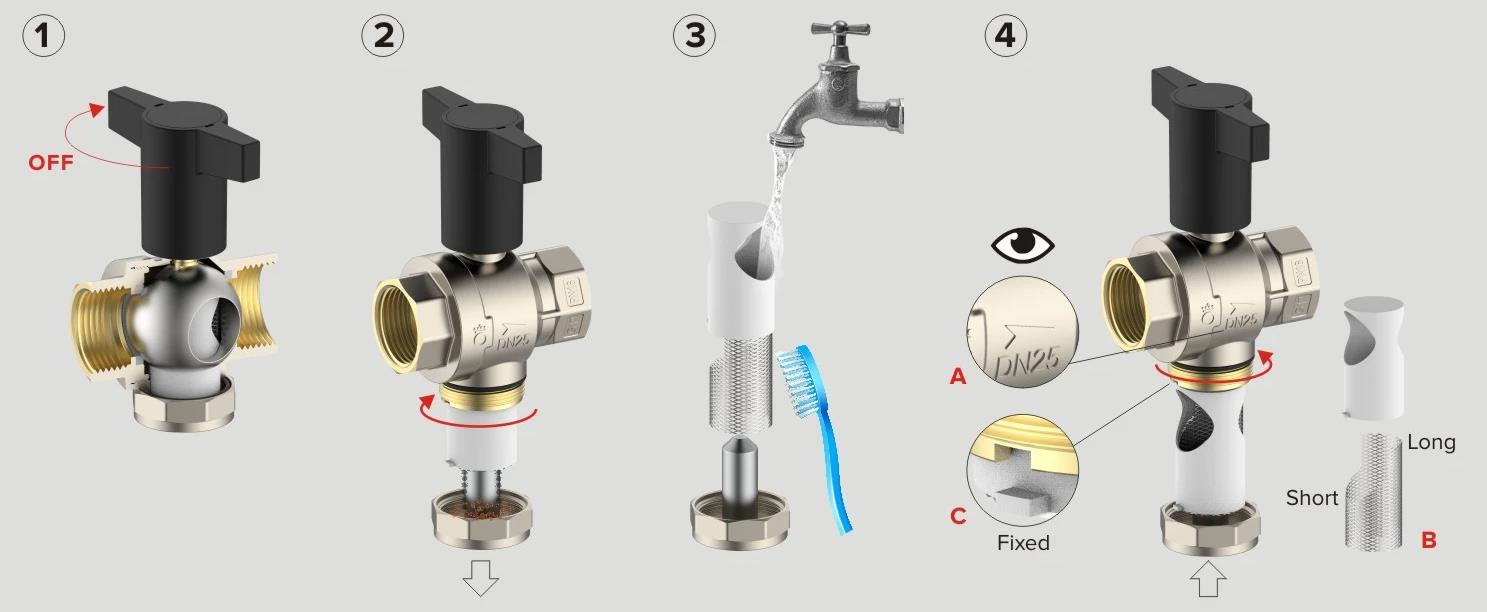 4. Сброс загрязнений — при закручивании пробки шлам и частицы смываются водой.