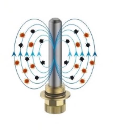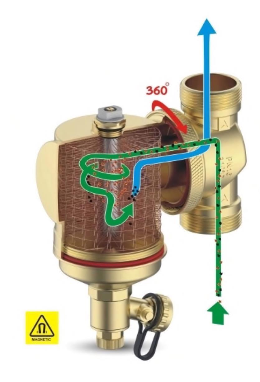 Встроенный мощный магнит создаёт сильное магнитное поле, которое эффективно улавливает ферромагнитные частицы — такие как ржавчина, окалина и металлическая пыль — прямо из потока теплоносителя.